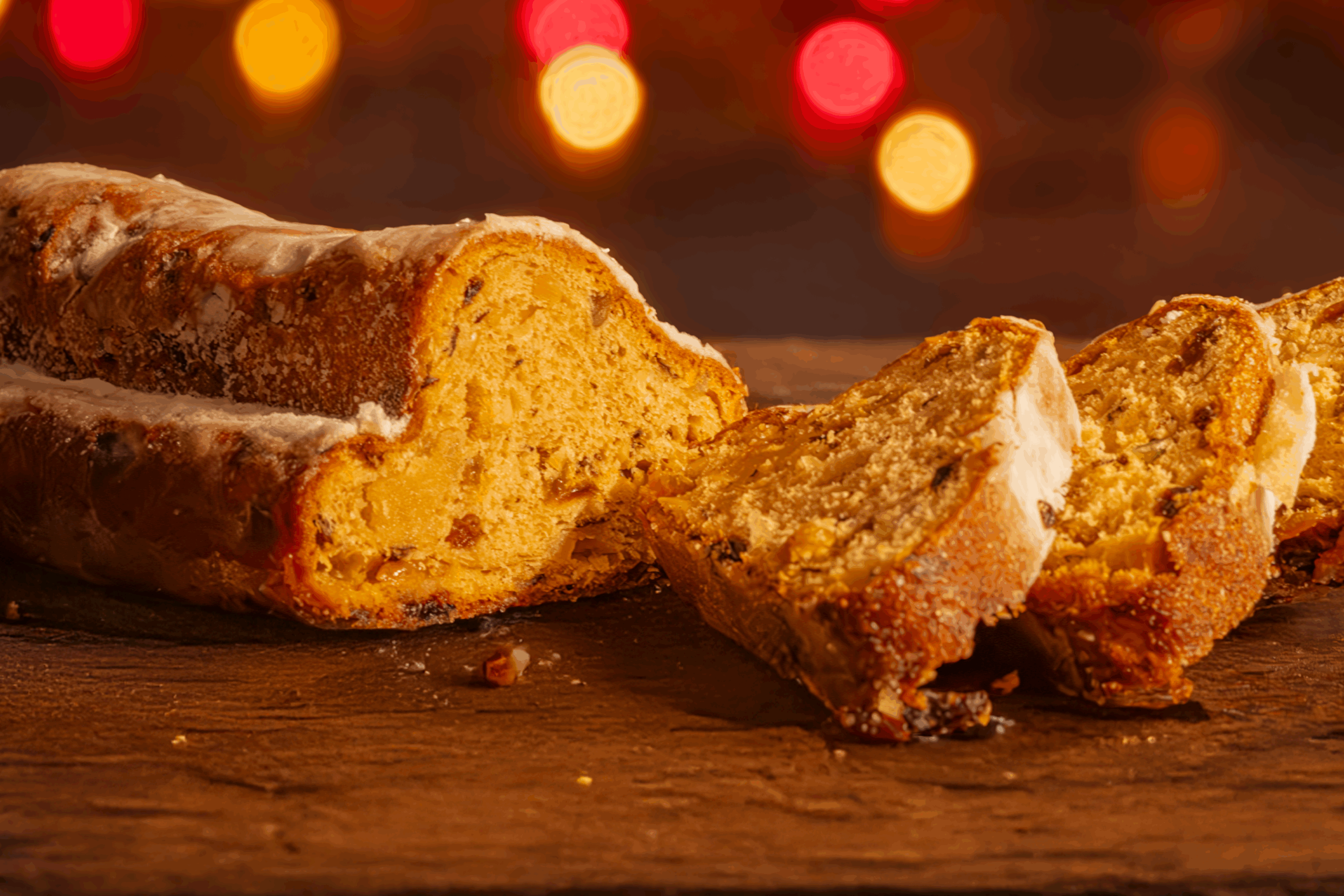 Traditional all-butter holiday stollen made with raisins, almond paste, silvered almonds, candied fruit, and festive spices.
