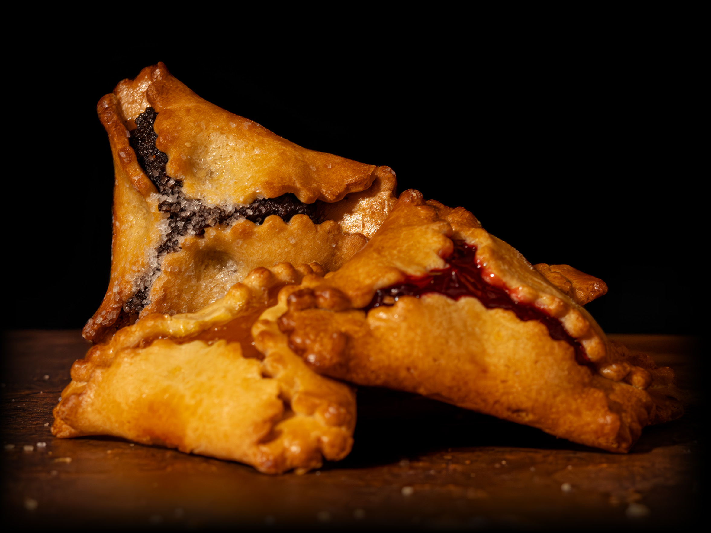 Our Hamantaschen are tender, buttery triangular cookies filled with classic apricot, raspberry, and poppy seed centers. Baked to golden perfection, each one offers a soft bite and sweet, traditional finish.